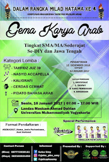 Gema Karya Arab 2017Perlombaan yang tersedia untuk tingkat SMA/MA/SMK/Sederajat yang ada di Daerah Itimewa Yogjakarta (DIY) adapun perlombaan terbut antara lain adalah sebagai berikut: