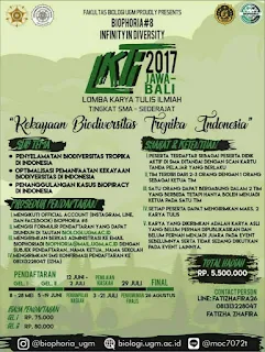 Info Lomba Karya Tulis Ilmiah [LKTI] BIOPHORIA 8 ini diselenggarakan oleh Fakultas Biologi Univeritas Gajah Mada (UGM). Dimana dalam lomba karya tulis ini ialah untuk pelajar SMA/SMK/Sederajat yang ada di wilayah Pulau Bali dan Pulau Jawa.