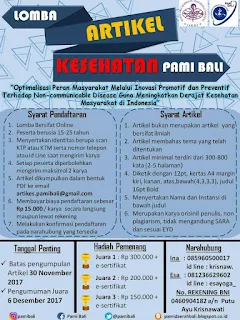 Hallo semuanya, dalam kesempatan yang baik inilah kami lagi-lagi akan memberikan informasi mengenai adanya sebuah event atau kompetisi yang diselenggarakan oleh PAMI Daerah Bali, lomba ini sendiri adalah Lomba Artikel Kesehatan Nasional 2017.