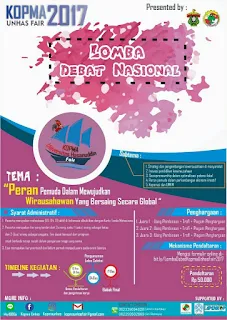 Informasi Kompetisi atau Lomba yang akan kami bagikan adalah Debat Nasional 2017 yang mana kompetisi ini sendiri diselengarakan oleh UKM Kopma UNHAS dalam serangkaian agendnanya Kopma Unhas Fair 2017, yang terdiri dari Lomba Essai dan Lomba Debat.