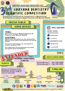 Hallo kalian semuanya, mimin informasi lomba akan kembali lagi nih untuk mengabarkan adanya kompetisi terbaru. Adapun untuk kompetisi tersebut ialah lomba desain poster dan membuat video pendek tingkat nasional di Tahun 2021 yang mana agenda ini sendiri diselenggrakan oleh Himpunan Mahasiswa Kedokteran Gigi Universitas Udayana dalam serangkaian agenda yang bernama UDAYANA DENTISTRY SCIENTIFIC COMPETITION (UDSC).